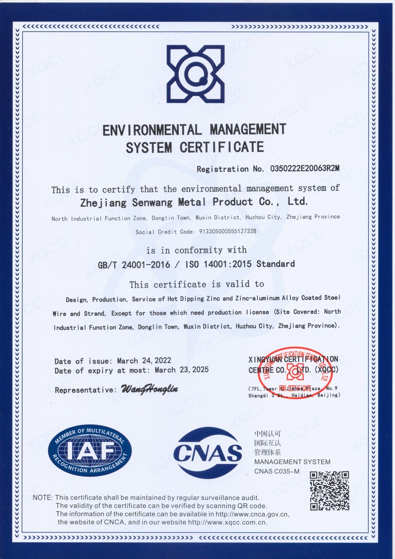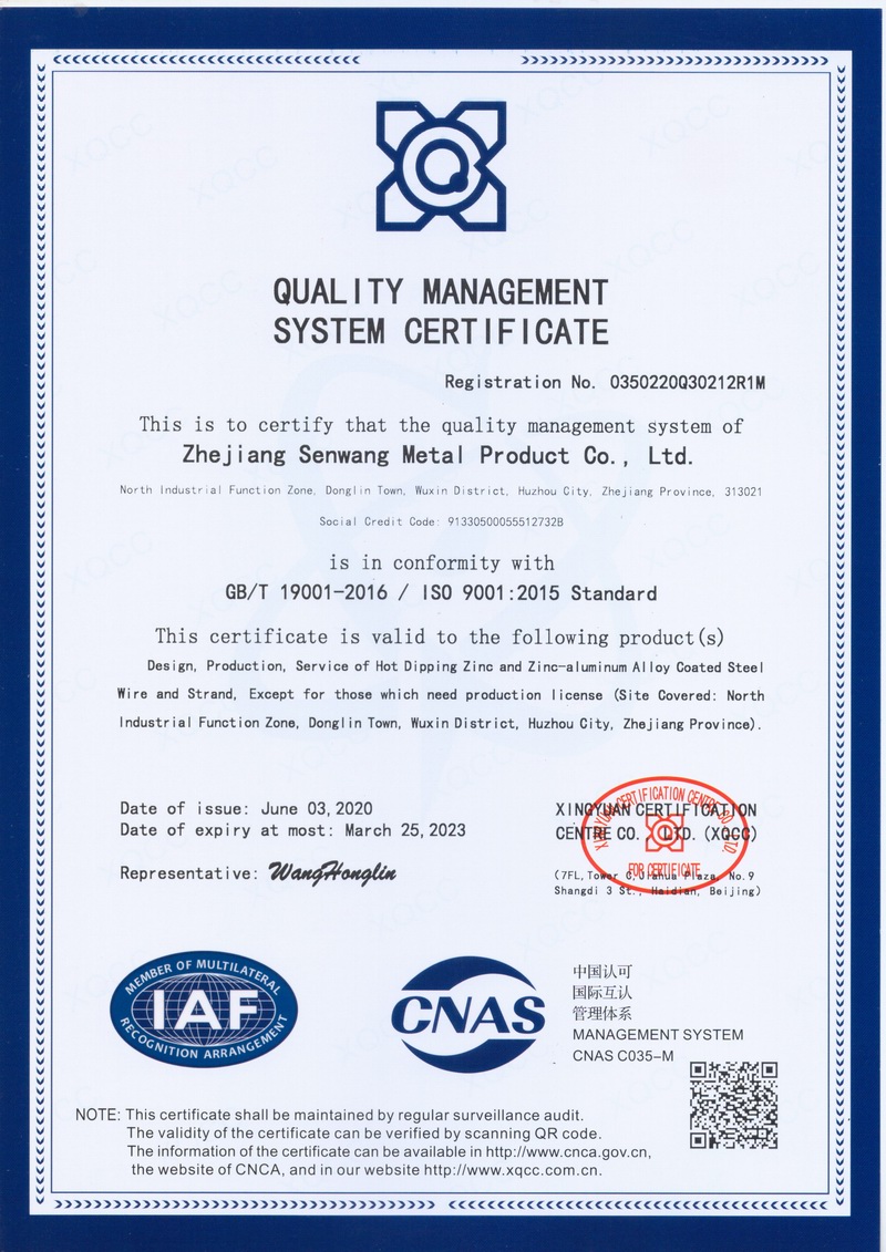 浙江森旺金屬制品有限公司成立于2012年,坐落湖州市吳興區(qū)東林鎮(zhèn)工業(yè)功能區(qū)。公司專(zhuān)業(yè)從事各類(lèi)鍍鋅鋼絲、鋼絞線等產(chǎn)品的開(kāi)發(fā)及生產(chǎn)。目前產(chǎn)品已廣泛應(yīng)用于各類(lèi)通信光電纜,電力輸送,電氣化鐵路工程,各類(lèi)堤壩防護(hù)及農(nóng)業(yè)溫室等工程領(lǐng)域。公司秉承“追求卓越品質(zhì),創(chuàng)建卓著信譽(yù)”的經(jīng)營(yíng)理念,始終堅(jiān)持專(zhuān)業(yè)化、規(guī)模化的經(jīng)營(yíng)模式。